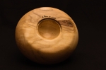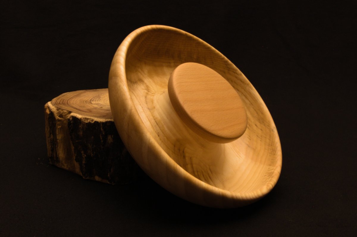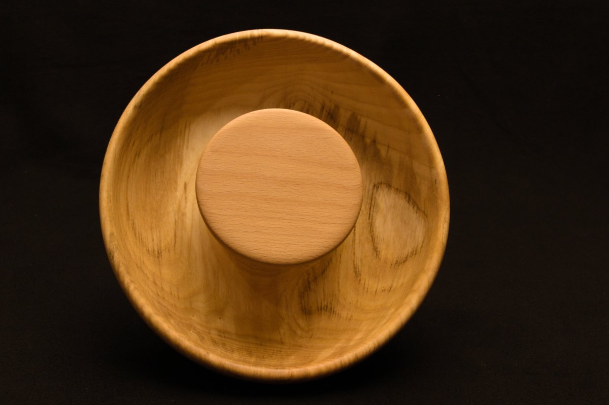 Diamètre entre 20 et 23 cm, profondeur +ou- 6 cm, bois massif et local, contenant en bois de frêne et plateau en bois de hêtre.