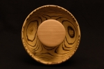 Diamètre entre 20 et 23 cm, profondeur +ou- 6 cm, bois massif et local, contenant en bois de frêne (brulé à la flamme) et plateau en bois de hêtre.