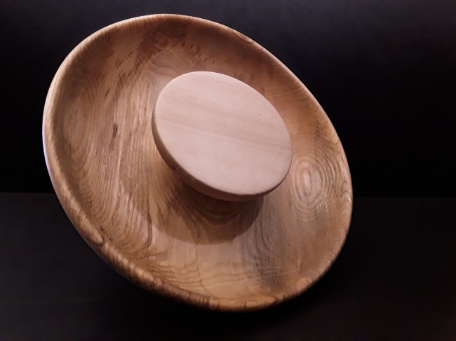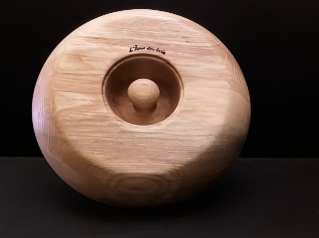 Diamètre 30 cm, profondeur +ou- 7 cm, bois massif et local, contenant en bois de frêne et plateau en bois de hêtre.