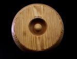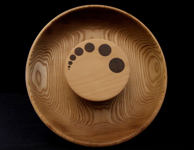 Diamètre 35cm, profondeur +ou- 6.5 cm, bois massif et local, contenant en bois de frêne et plateau en bois de hêtre avec des incrustations en noyer massif.