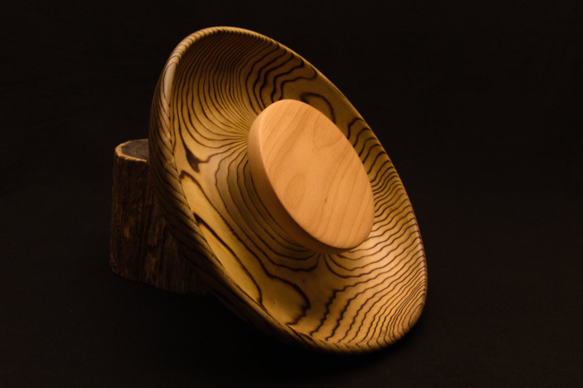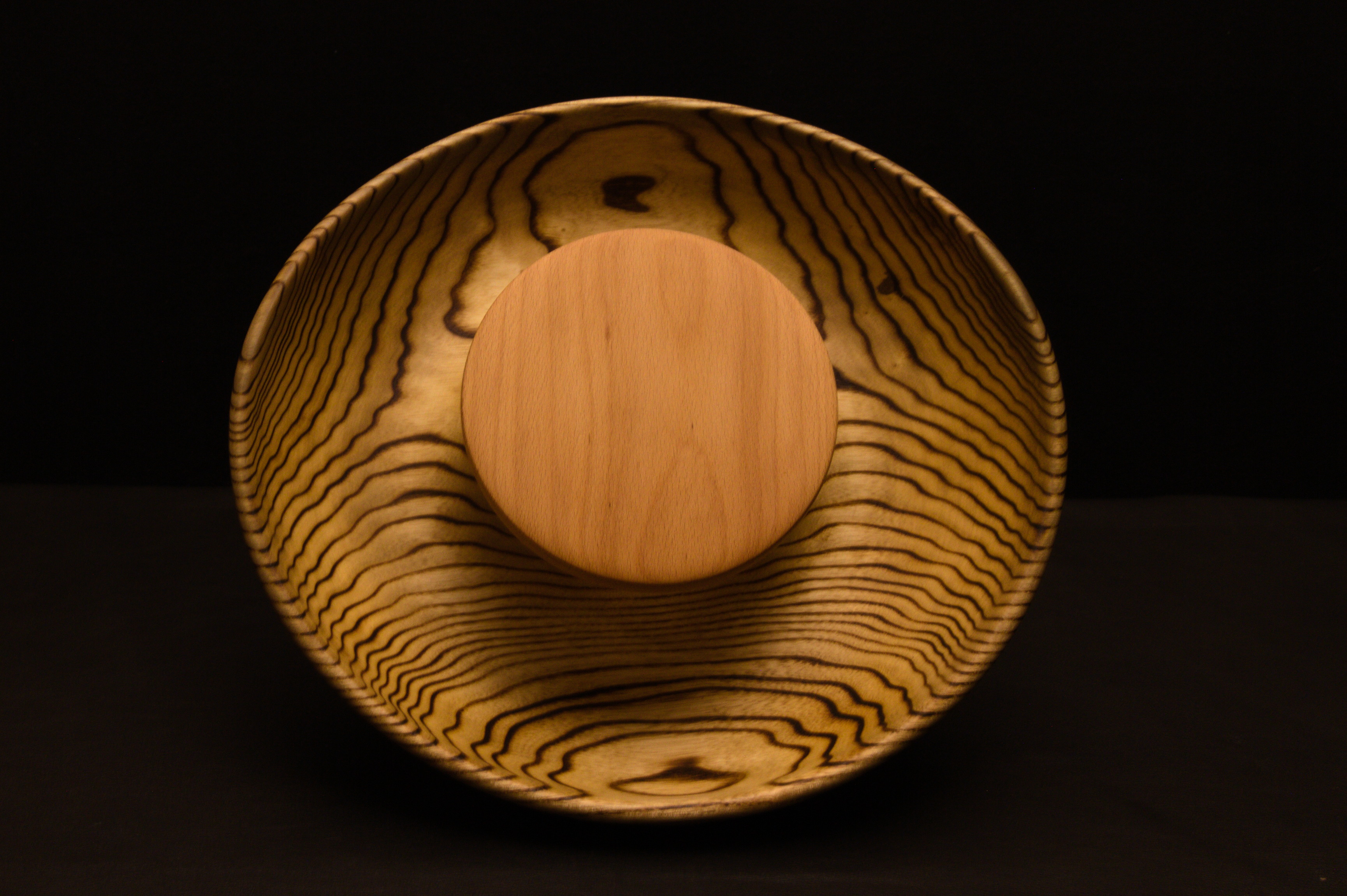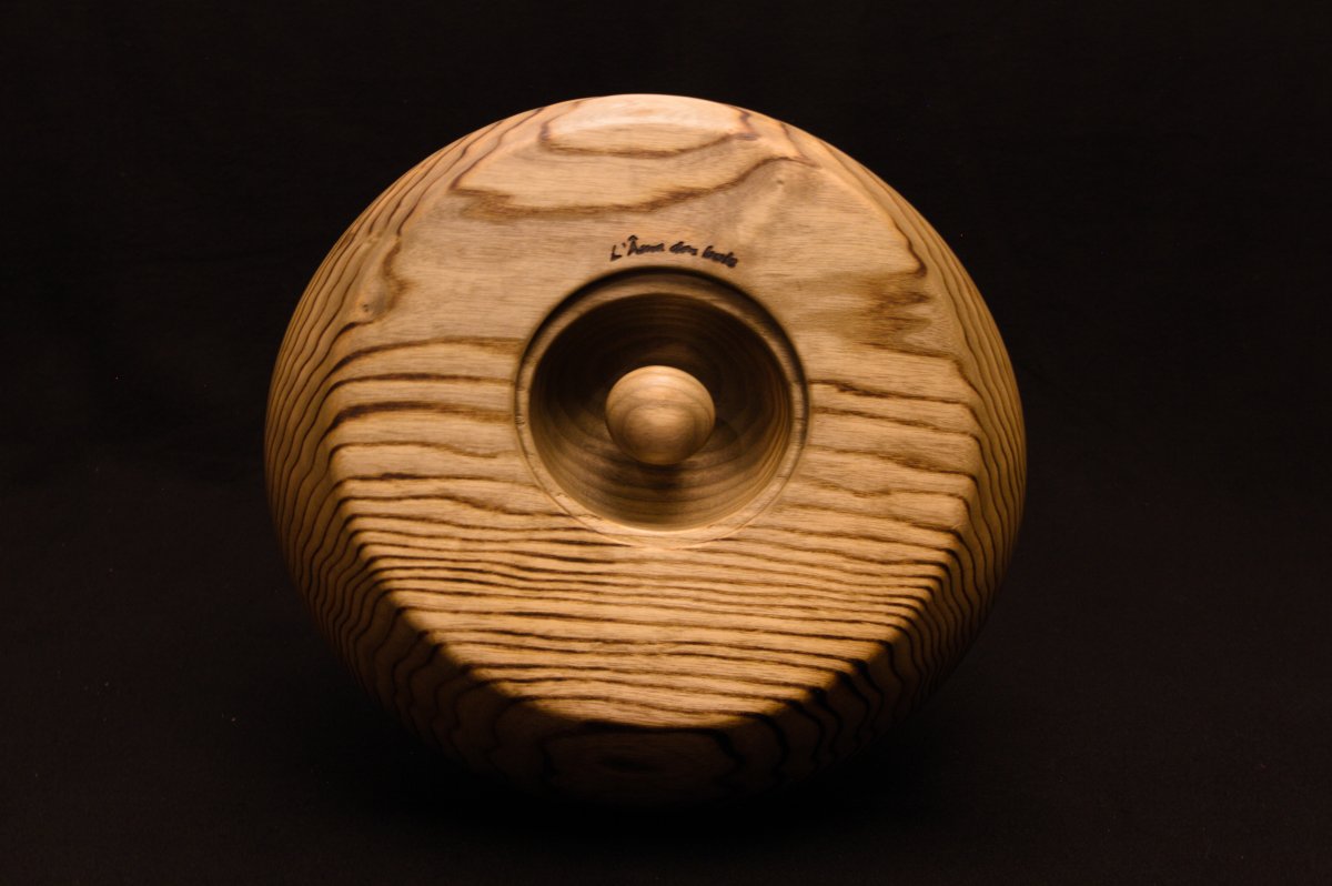 Diamètre 30 cm, profondeur +ou- 7 cm, bois massif et local, contenant en bois de frêne (brulé à la flamme) et plateau en bois de hêtre.