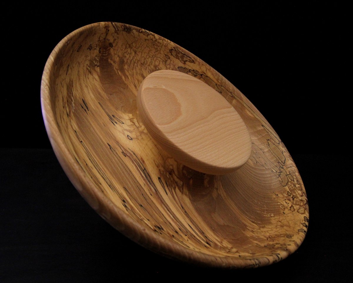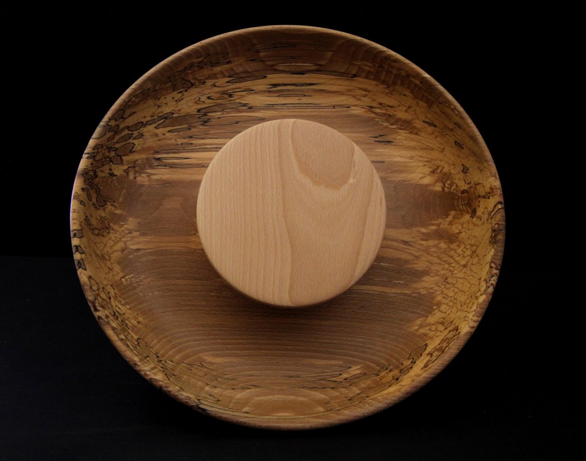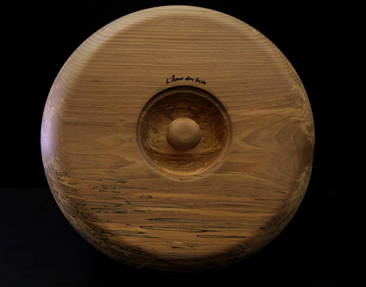 Diamètre 35cm, profondeur +ou- 6.5 cm, bois massif et local, contenant en bois de hêtre échauffé et plateau en bois de hêtre.
