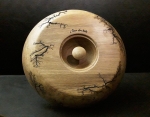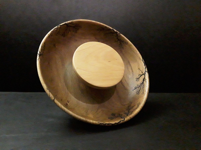 Diamètre 30cm, profondeur +ou- 7 cm,cm, bois massif et local, contenant en bois de hêtre finitions fractales (Figure de lichtenberg) et plateau en bois de hêtre.