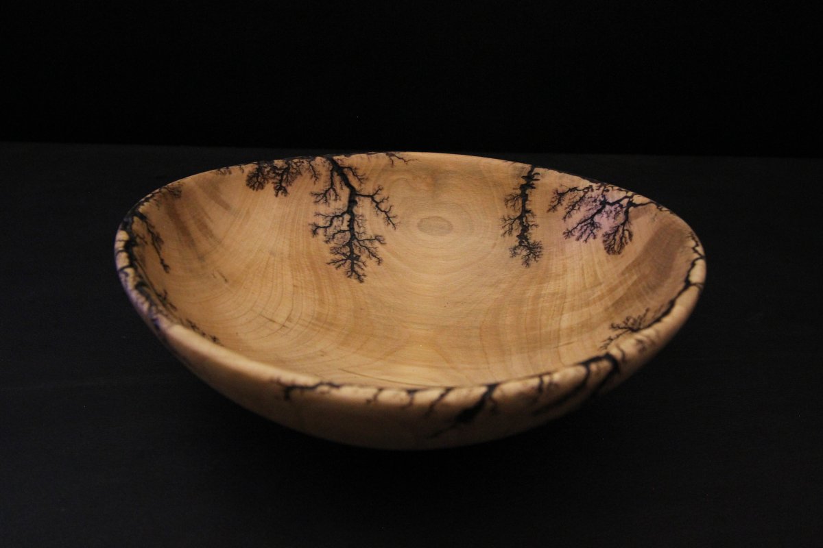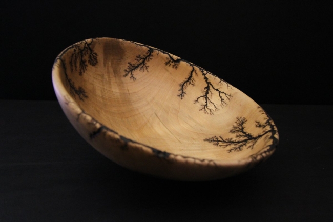 Le hêtre est reconnu pour sa robustesse et son grain soyeux. Dans cette création, j'ai voulu confronter cette sérénité aux brûlures imprévisibles de la haute tension. Chaque coupe raconte une histoire différente, car l'électricité ne suit jamais deux fois le même chemin. (figure de lichtenberg)