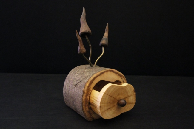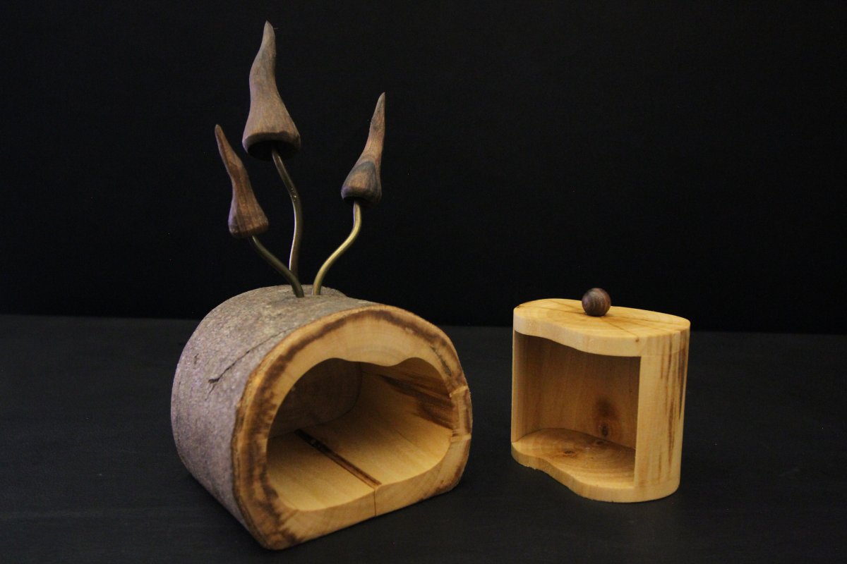 Sa particularité réside dans son petit tiroir discret et ses trois champignons en noyer, tournés avec une précision en excentrique sur trois axes. Montés sur des tiges de cuivre, ces champignons sont simplement emboîtés : vous pouvez ainsi les orienter à votre guise pour créer votre propre mise en scène naturelle.
