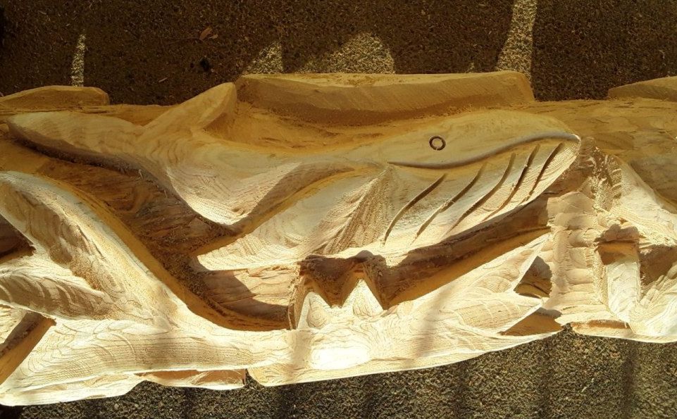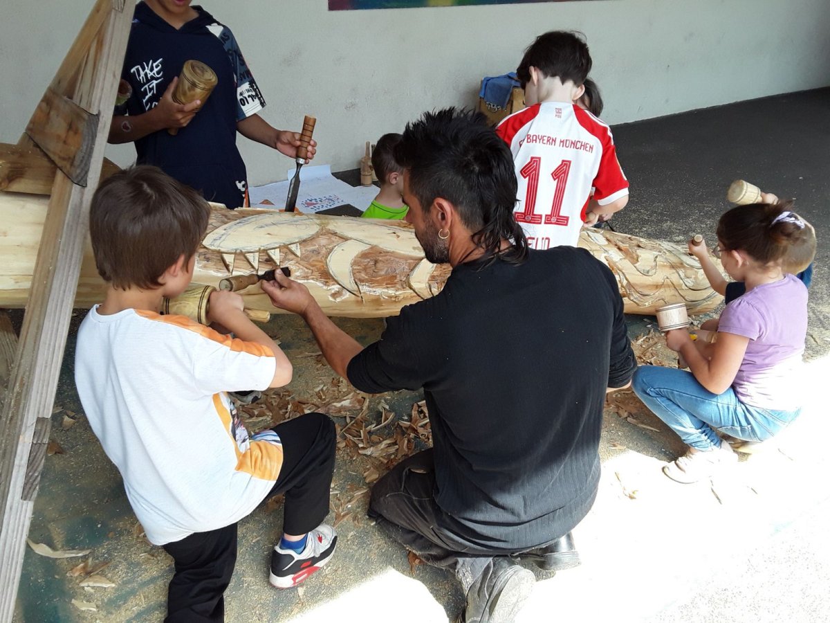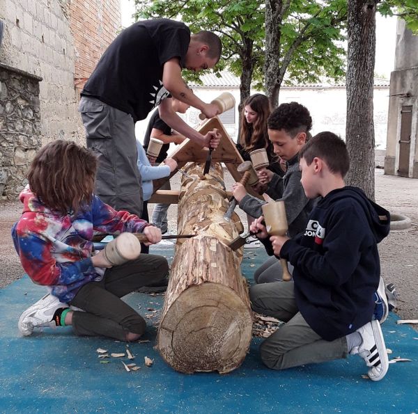 Avant chaque atelier, chaque élève réalise un dessin de ce qu’il souhaite transmettre : symboles, animaux, éléments de nature, valeurs. Nous présentons ensuite les règles de sécurité, les outils et les gestes de base. Le travail se fait par petits groupes entre 4 et 8 élèves, pour que chacun puisse s’exprimer. Sur deux journées, nous sculptons ensemble ; je reprends enfin les motifs pour harmoniser l’ensemble sans trahir les dessins.